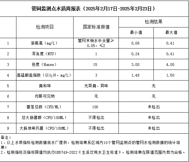 管網(wǎng)監(jiān)測點(diǎn)水質(zhì)周報表(2025年2月17日-2025年2月23日)