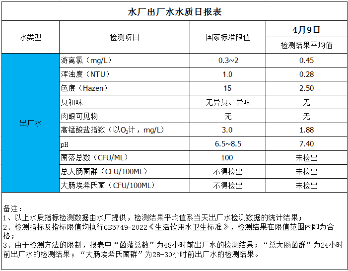 水廠出廠水水質(zhì)日報表(2025-4-9)