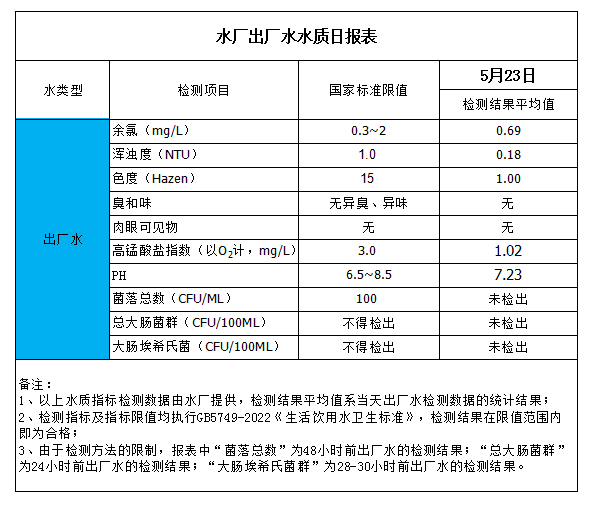 水廠出廠水水質(zhì)日報表(2023-5-23)