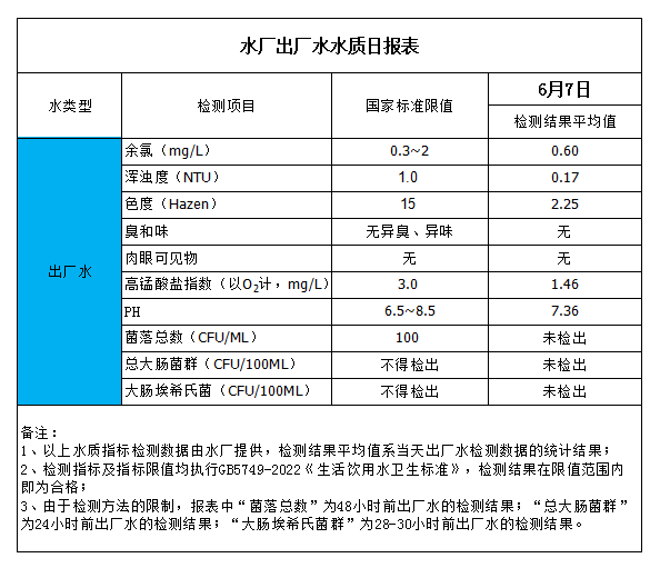 水廠出廠水水質日報表(2023-6-7)