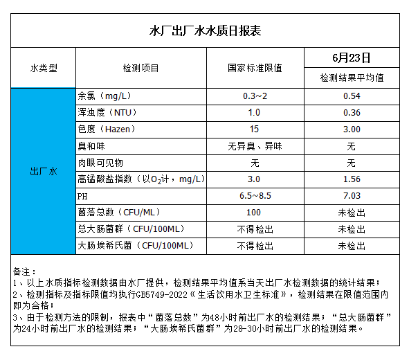 水廠出廠水水質(zhì)日報(bào)表(2023-6-23)