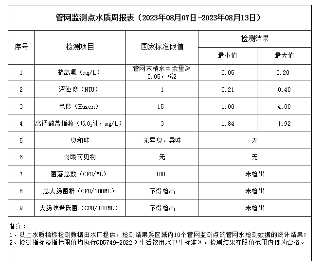 管網監測點水質周報表(2023年08月07日-2023年08月13日)