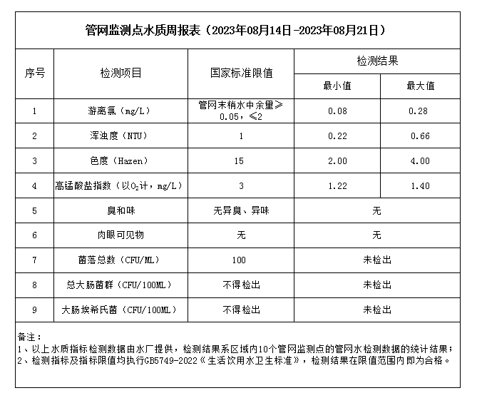 管網監測點水質周報表(2023年08月14日-2023年08月21日)