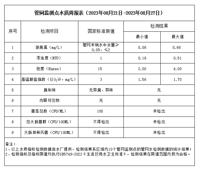 管網監測點水質周報表(2023年08月21日-2023年08月27日)