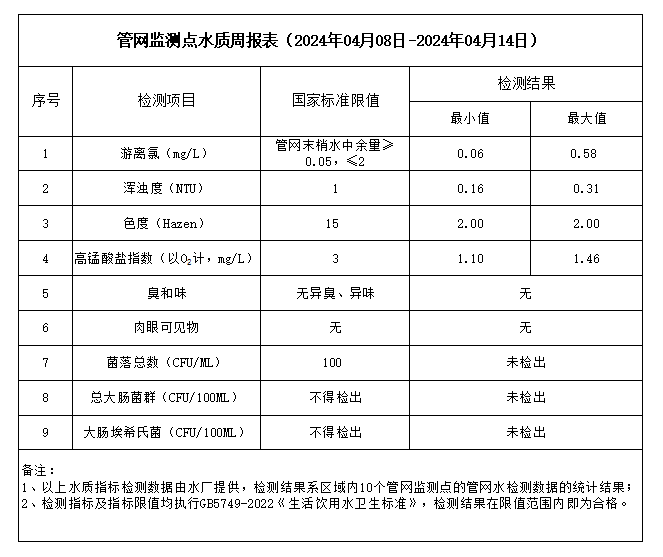 管網監測點水質周報表(2024年04月08日-2024年04月14日)