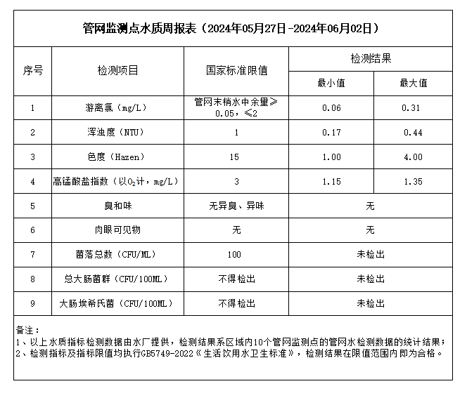管網監測點水質周報表(2024年05月27日-2024年06月02日)