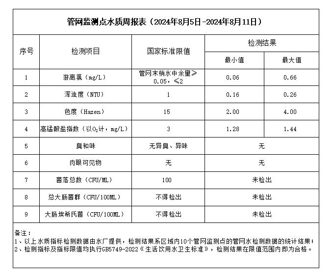 管網監測點水質周報表(2024年8月5日-2024年8月11日)