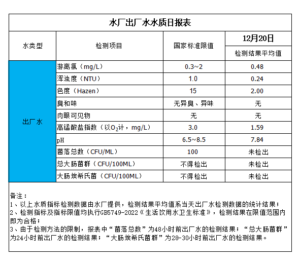 水廠出廠水水質日報表(2024-12-20)